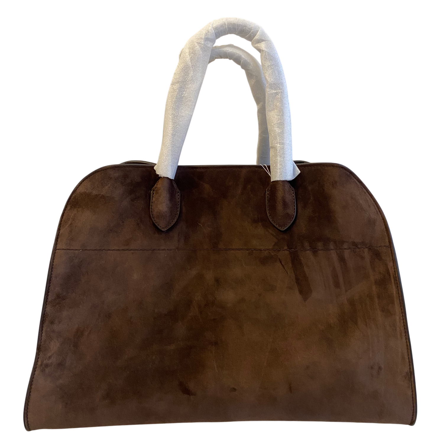 The Row Margaux 15 in Mocha brown suede embodies the brand’s minimalist elegance and refined craftsmanship. Finished with gold-tone hardware, this unworn designer bag is a timeless symbol of understated luxury.