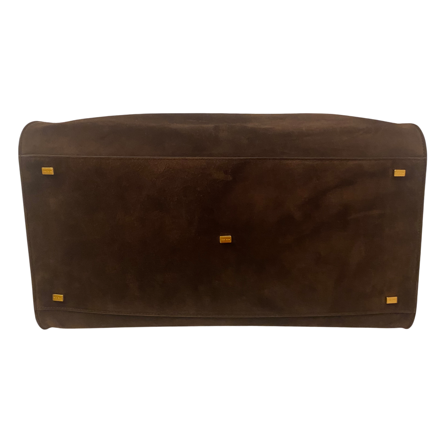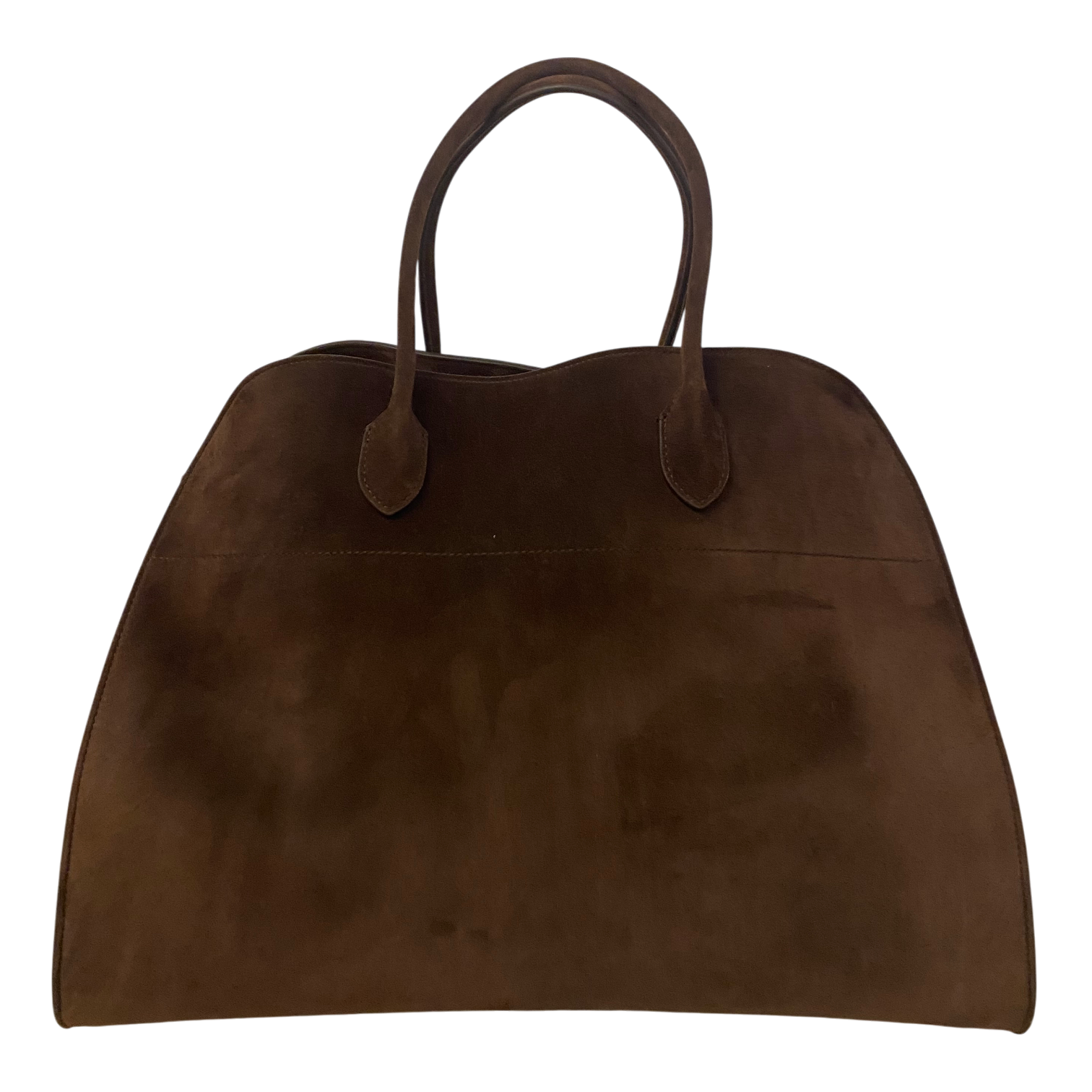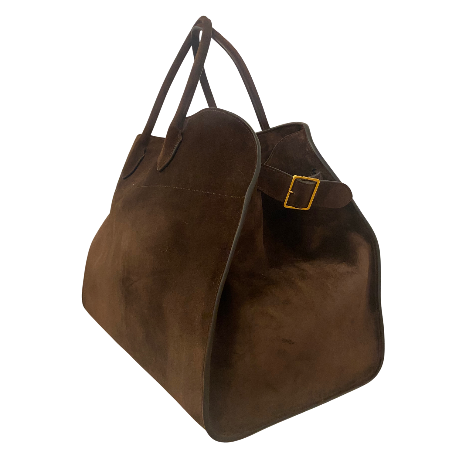 The Row Margaux 17 in Mocha brown suede reflects the brand’s signature minimalist luxury. Accented with gold-tone hardware, this unworn designer bag embodies quiet sophistication and timeless craftsmanship.