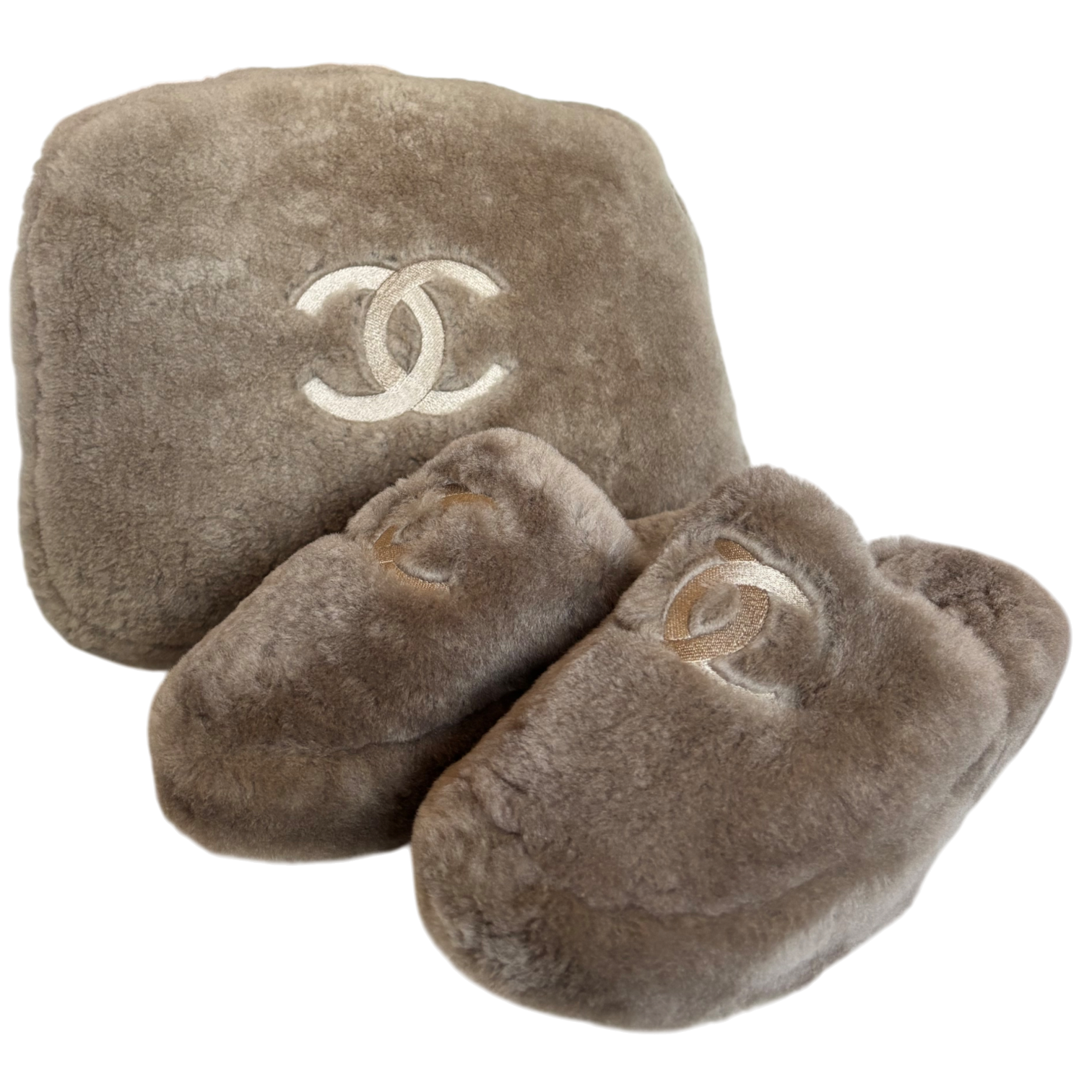 The Chanel Fur Pouch & Mule Slipper Set in brown shearling combines cozy comfort with signature Chanel luxury. Featuring the iconic CC logo, this designer set offers plush warmth and timeless elegance, perfect for travel or refined relaxation.